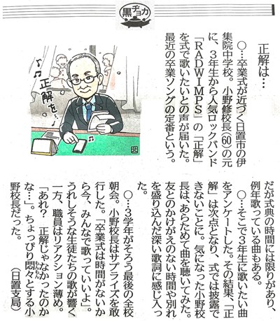 朝から、小野さん! 朝から新聞の切り抜きが届く。僕の友だちが綴られている。 あぁ答えがある問いばかりを 教わってきたよ そのせいだろうか 僕たちが知りたかったのは いつも正解など大人も知らない 先週、小野さんの学校をたずねたとき、廊下にあったことばもRADWIMPSのもの。 小野さん、やるなあ、浜田省吾ばかりじゃないんだ。僕も、もっと言葉に学びたい。若い感受性に学びたい。 朝から、ほんとうにいい気分。ありがとうございます、小野さん、南日本新聞。 神さま、きょうもいつくしみをありがとうございます。